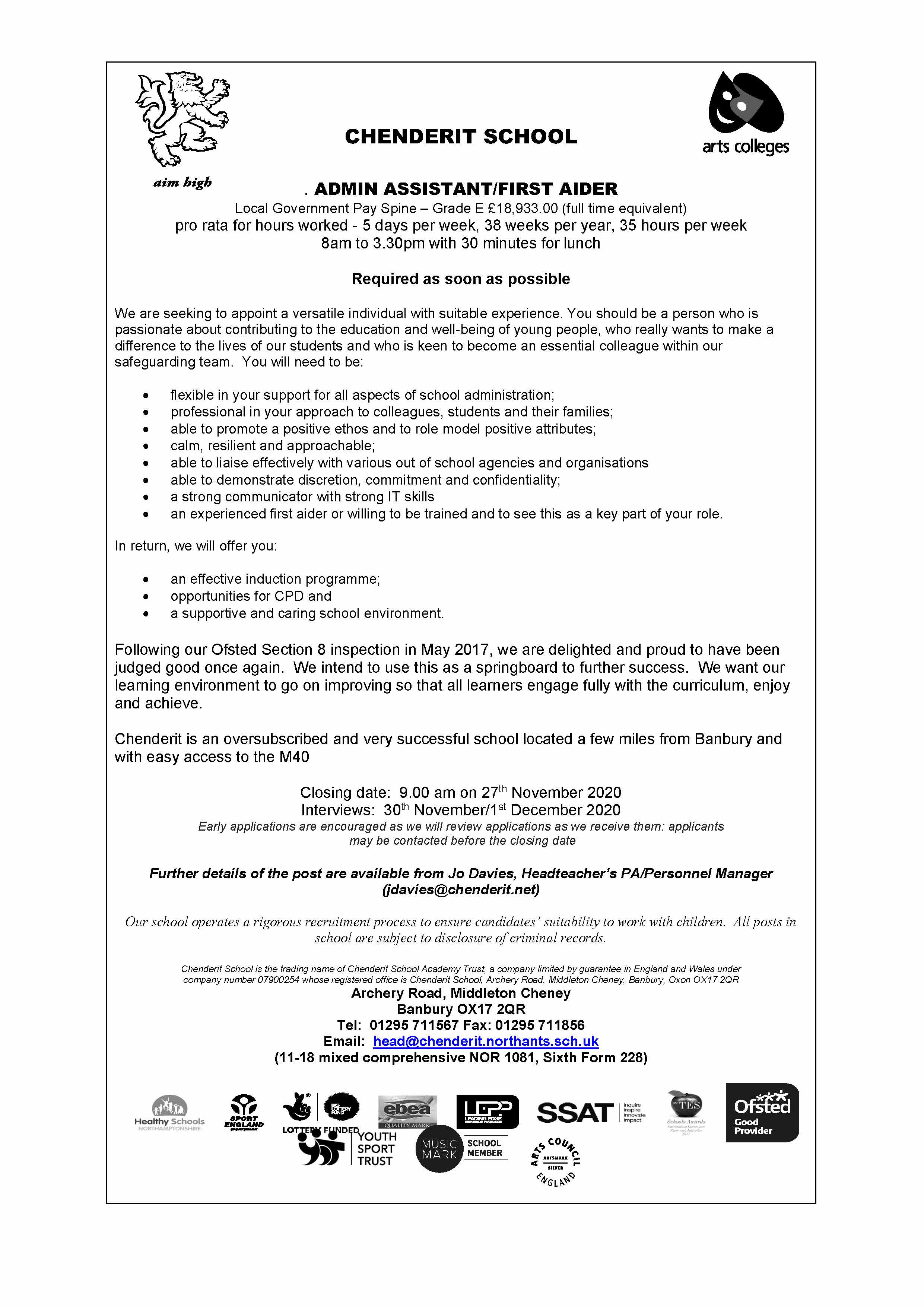 Chenderitschool On Twitter We Re Hiring Admin Assistant First Aider Required As Soon As Possible Applications Closing At 9am On November 27th See Flyer Or Contact Jdavies Chenderit Net Https T Co Bdnhuuffpc Twitter